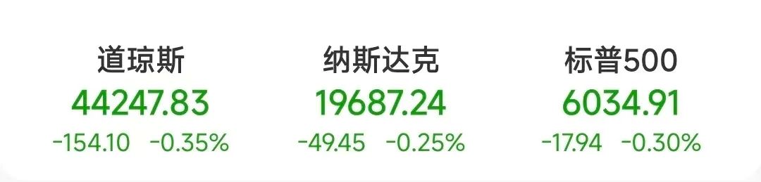 当地时间12月10日,美股三大指数集体收跌,截至收盘,道指跌154.10点,跌幅为0.35%,报44247.83点;纳指跌49.45点,跌幅为0.25%,报19687.24点;标普500指数跌17.94点,跌幅为0.30%,报6034.91点。