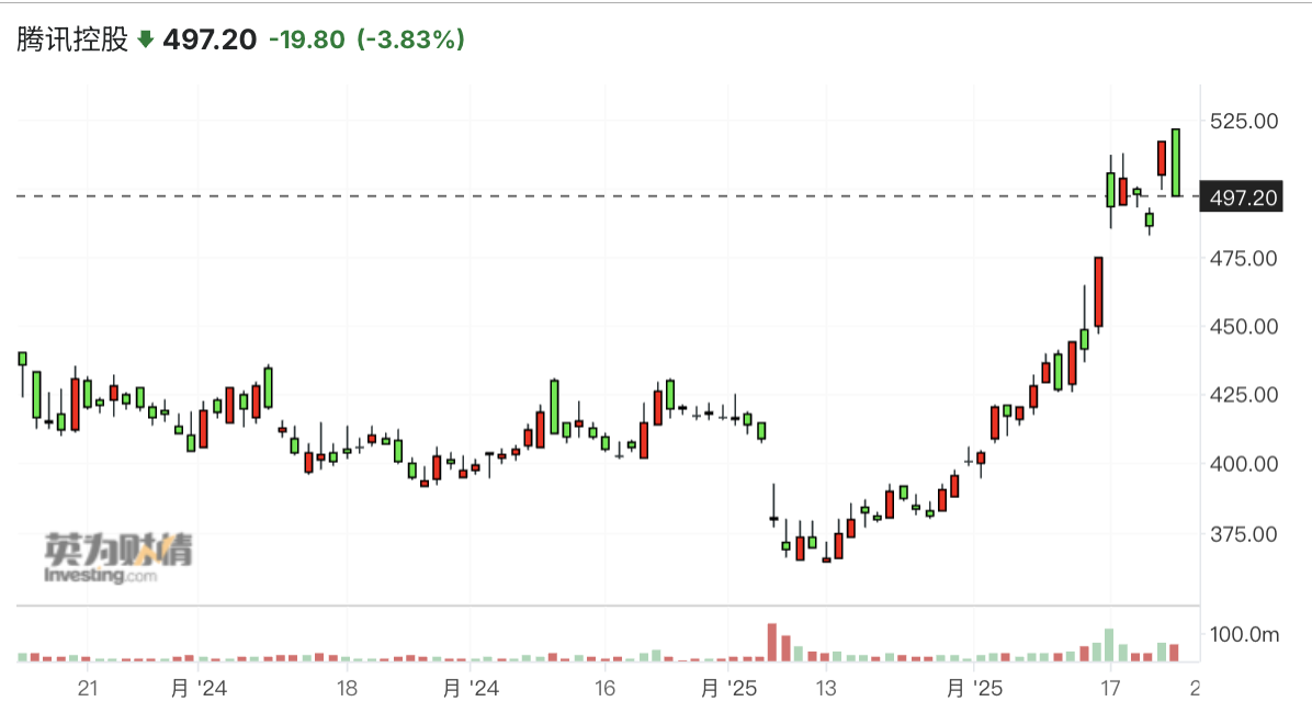 除了阿里巴巴,腾讯亦因为DeepSeek而股价大幅反弹,2月24日一度突破500港元大关。