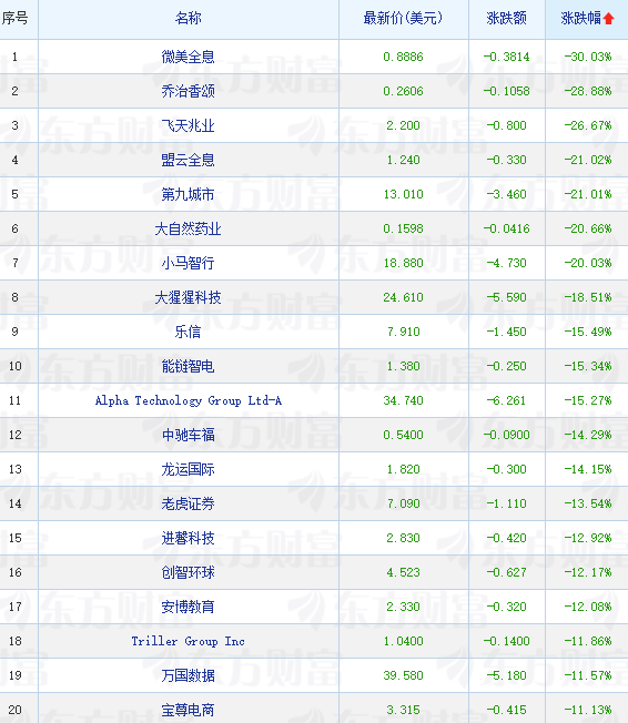 领跌中概股列表: