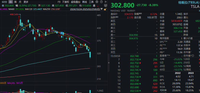 特斯拉股价大跌,收盘跌超8%,盘中跌幅一度超过10%,今年2月以来特斯拉股价累计已下跌超过25%。
