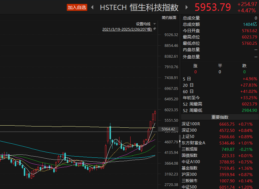 近期,人工智能大模型DeepSeek的出现推动中国科技股持续上涨。截至上周,恒生科技指数已连续六周上涨。