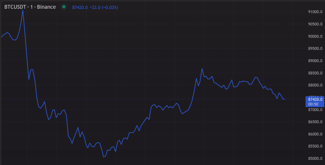 该消息发布后,比特币短线跳水,盘中一度跌破85000美元。随后又快速拉升,最新报价87420美元。事实上,比特币近期已经明显走弱,前两天一度从100000美元附近一举跌破80000美元。