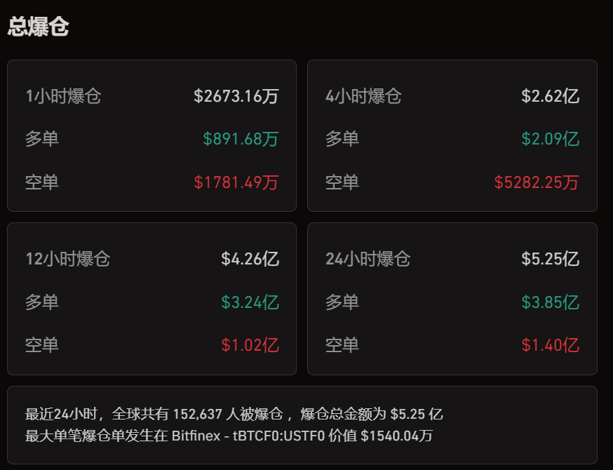 多空双杀的行情,使很多投资者血本无归。Coinglass数据显示,近24小时内有超过15万人爆仓,爆仓金额为5.25亿美元(约合人民币38亿元)。