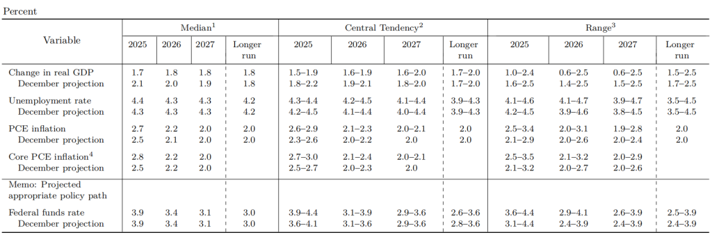 预测今年的失业率为4.4%,较去年12月的预测上升0.1个百分点;预测今年PCE(个人消费支出)通胀为2.7%(去年12月预测值2.5%),2026年将回落至2.2%(去年12月预测值2.1%);预测今年核心PCE通胀为2.8%(去年12月预测值2.5%),2026年将回落至2.2%(去年12月预测值2.2%)。