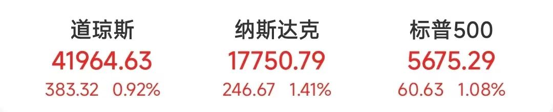 昨夜,美股三大指数收高,科技股领涨。截至收盘,道指涨383.32点,涨幅为0.92%,报41964.63点;纳指涨246.67点,涨幅为1.41%,报17750.79点;标普500指数涨60.63点,涨幅为1.08%,报5675.29点。