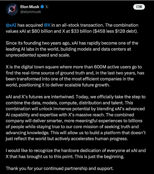 特斯拉创始人兼首席执行官马斯克当地时间3月28日在社交媒体平台X发文称,xAI以全股票交易的方式收购X。这笔交易对xAI的估值为800亿美元,对X的估值为330亿美元,即450亿美元减去120亿美元的债务。