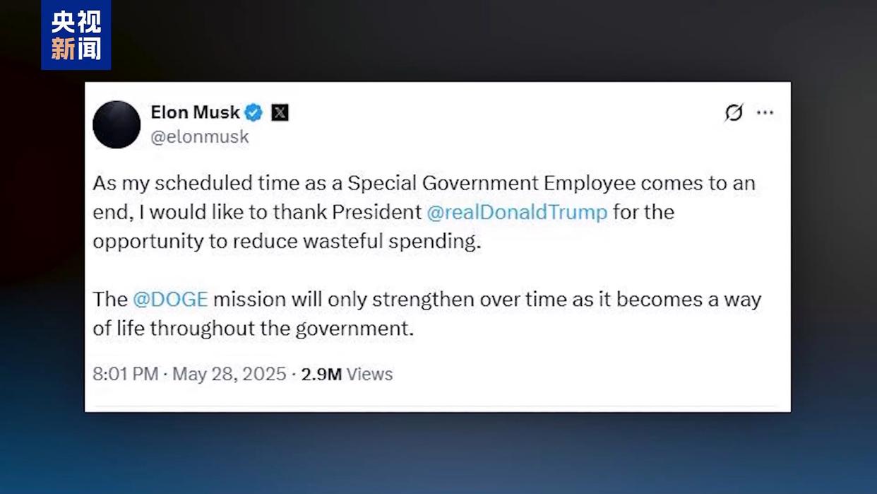 5月28日,美国“政府效率部”负责人马斯克在社交媒体平台上官宣自己的离职决定,美国总统特朗普则在5月29日称,5月30日是马斯克在“政府效率部”任职的最后一天。