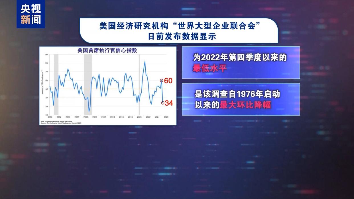美国经济研究机构“世界大型企业联合会”日前发布数据显示,美国2025年第二季度首席执行官信心指数从此前的60点跌至34点,为2022年第四季度以来的最低水平,这也是该调查自1976年启动以来的最大环比降幅。外界普遍认为,该指数低于50表明首席执行官对经济前景持悲观态度。