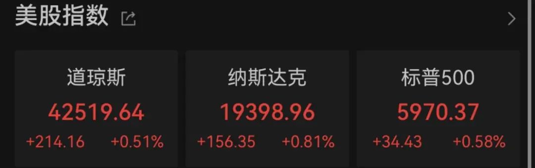 截至收盘,道指涨0.51%,报42519.64点,录得四连涨;标普500指数涨0.58%,报5970.37点;纳指涨0.81%,报19398.96点。