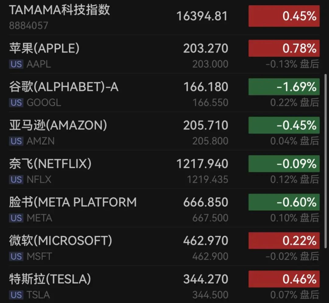 苹果涨0.78%,特斯拉涨0.46%,微软涨0.22%,亚马逊跌0.45%,脸书跌0.6%,谷歌跌逾1%。