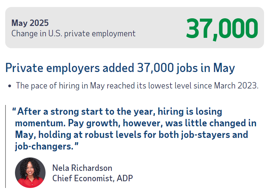 具体来看,美国5月ADP就业人数3.7万人,为2023年3月以来最小增幅,市场预期为11万人,前值为6.2万人。
