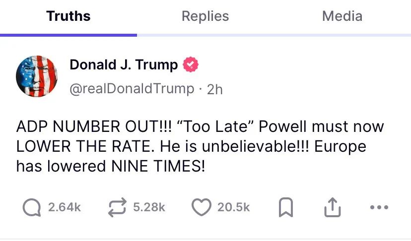 在美国5月ADP就业数据发布后,特朗普再度发帖喊话鲍威尔。特朗普写道:“ADP就业报告出来了,‘太迟先生’鲍威尔现在必须降息。这太难以置信了!欧洲已经降息了九次!”