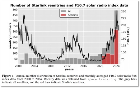 数据显示,2020年至2024年期间,共有1190颗低地球轨道卫星坠落,其中有583颗都是“星链”卫星。而在2024年,就有316颗“星链”卫星在大气层中烧毁。