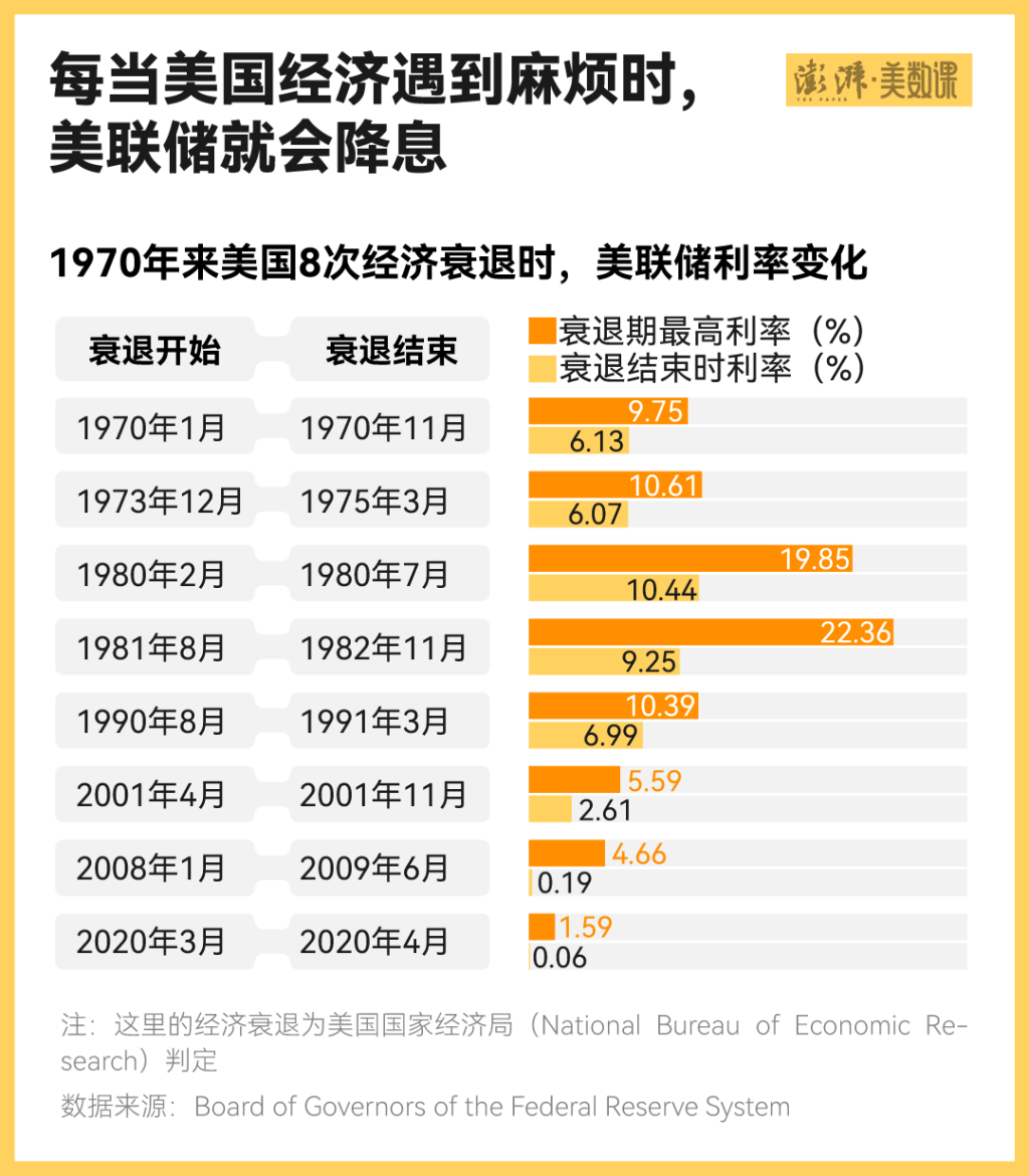 通过回溯过往半个世纪的美国经济衰退期会看到,美联储在这些时期无一例外都采取了降息手段。