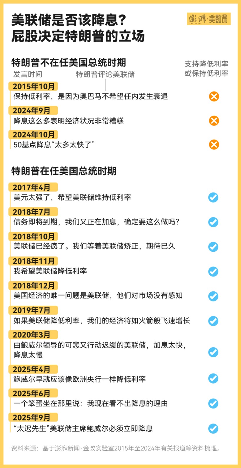 澎湃新闻梳理了过去10年,特朗普从政以来针对美联储的公开发言后发现,尽管特朗普的“不喜欢利率上升”的观点确实从没有变过,但他觉得美联储是否应该降息,则取决于他是不是美国总统。