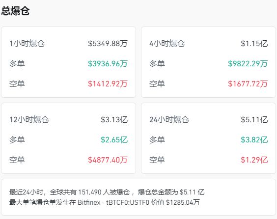 比特币跌超3%。数据显示最近24小时,加密币全网共有151465人被爆仓,爆仓总金额为5.11亿美元(约合人民币36亿元)。