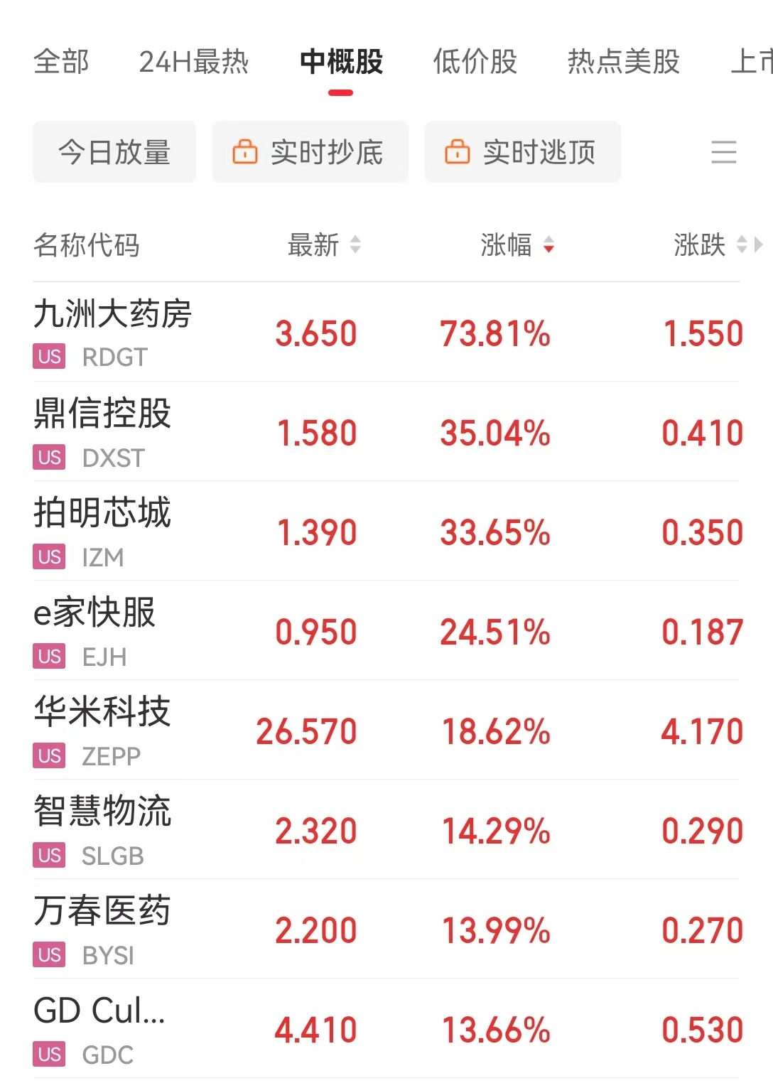 九州大药房涨73.81%,鼎信控股涨35.04%,华米科技涨18.62%。