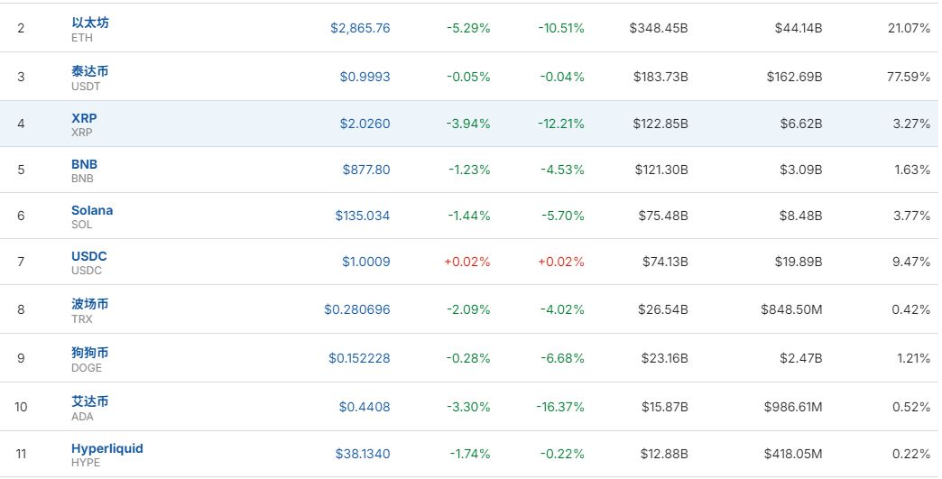 以太坊跌超5%,艾达币跌超3%。