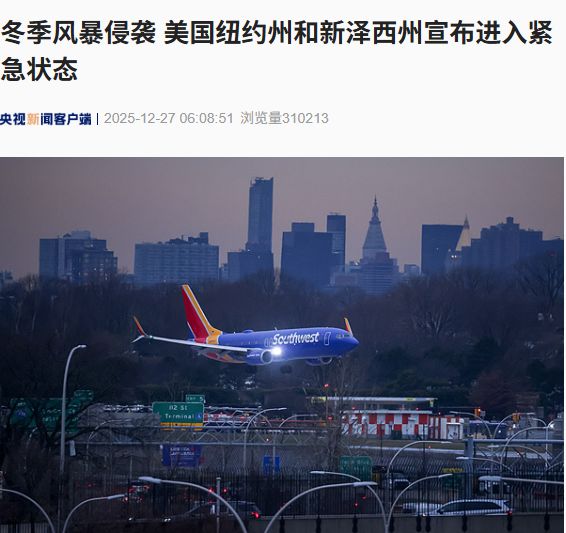 据央视新闻,当地时间12月26日,总台记者获悉,一场强烈冬季风暴正侵袭美国东北部,纽约市、新泽西州及纽约州北部出行条件迅速恶化。纽约市预计将迎来近四年来最大降雪,降雪量约7英寸。